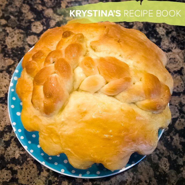 Put the yeast & sugar in a cup with the warm water to raise 5-10 minutes. Next scald the milk so it can cool to lukewarm. After you take the milk off the stove, add the butter to help let it cool and melt. Grease large mixing bowl. Measure 6 cups of flour and make a well, then add the milk, yeast and 1 cup sugar and let rise 7 minutes. Then break the eggs while flour is rising, put in a small bowl and wisk each egg to mix it, you do not want chunks of egg in the dough. Add egg mixture to the flour mixture a little at a time and mix. Add raisins, salt, and rest of flour one cup at a time with a spoon until you have to mix it with your hands, and the dough becomes sticky. It will not stick to the bowl any more. Let dough raise 1 1/2 – 2 hours, then punch dough down and start making your bread balls. Make braids after you make only 1-2 breads and put your crosses on and secure with skinny toothpicks. Mix 1 egg yolk with a little water and brush on paska before baking and again 5 minutes before they are done baking to get all the missed areas. Bake at 350 F for 20 minutes, if you see to tops are getting brown and bottom is raw, place aluminum foil over top and bake another 20 minutes. Check every 5-7 minutes for doneness until bread is a golden brown. When you tap the bottom of the bread it should sound hollow. Enjoy your delicious bread. My favorite is to eat it as toast!