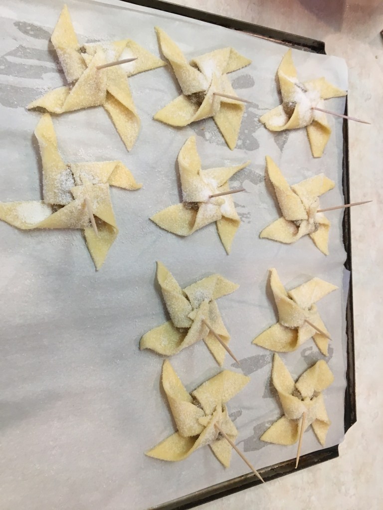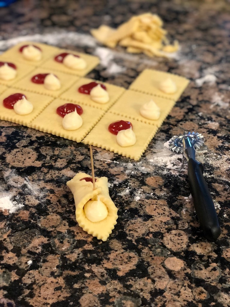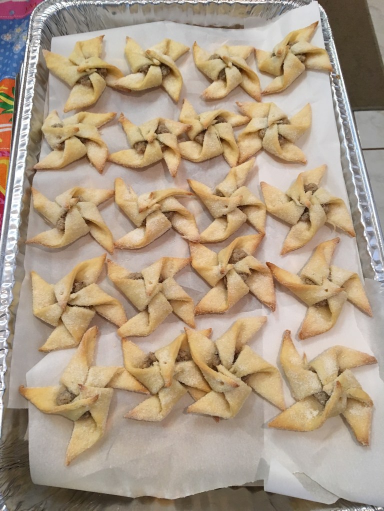 When the dough is ready, roll dough to 1/4 inch thick on a surface with flour and sugar; cut into 2 1/2 inch squares. Place on lightly greased baking sheets or covered in parchment paper. Spoon about 1/4 tsp of each filling in the center of each cookie. Roll sides into the center to form an envelope shape and then sprinkle with sugar before baking. Use toothpicks to hold the shape together. Bake at 350 F for 12-15 minutes or until lightly brown on the bottom.