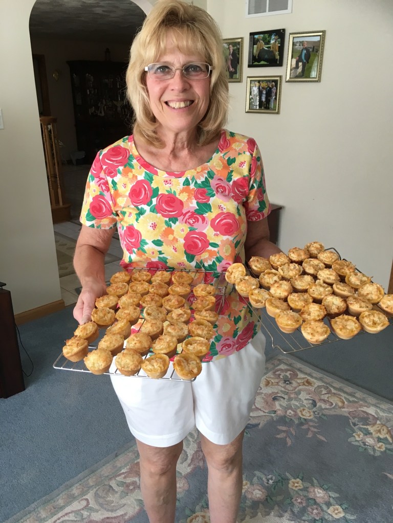 Combine together the last 3 items. Spoon 1 tsp preserves in the bottom of the cup first. Then spoon 1 tsp of the mixture on top of the preserves. Bake at 350 for 10-15 minutes or until light brown.
