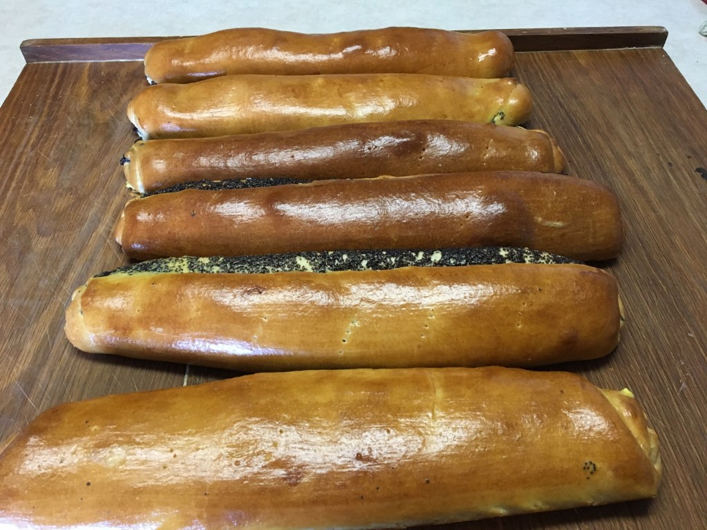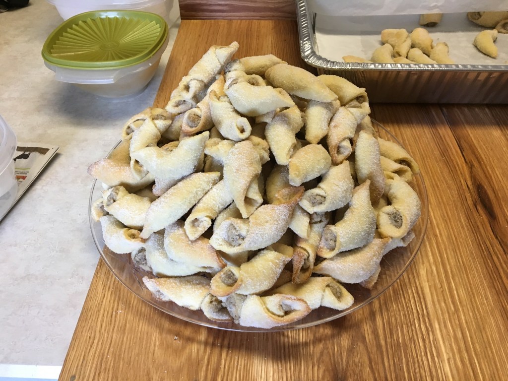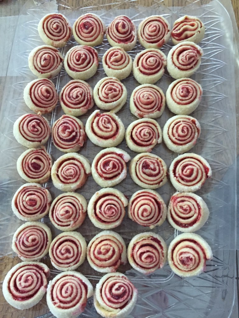 Dissolve yeast in 1/4 warm milk with sugar. Melt butter and cool. Beat eggs then add yeast, butter, sugar and flour. Mix thoroughly. Store dough in the refrigerator until well chilled (overnight). Divide dough in 4’s. Roll out and spread filling over dough. Roll up like a jelly roll and cut into slices before putting on the pan. Bake at 350 for 8-10 minutes or until light brown.