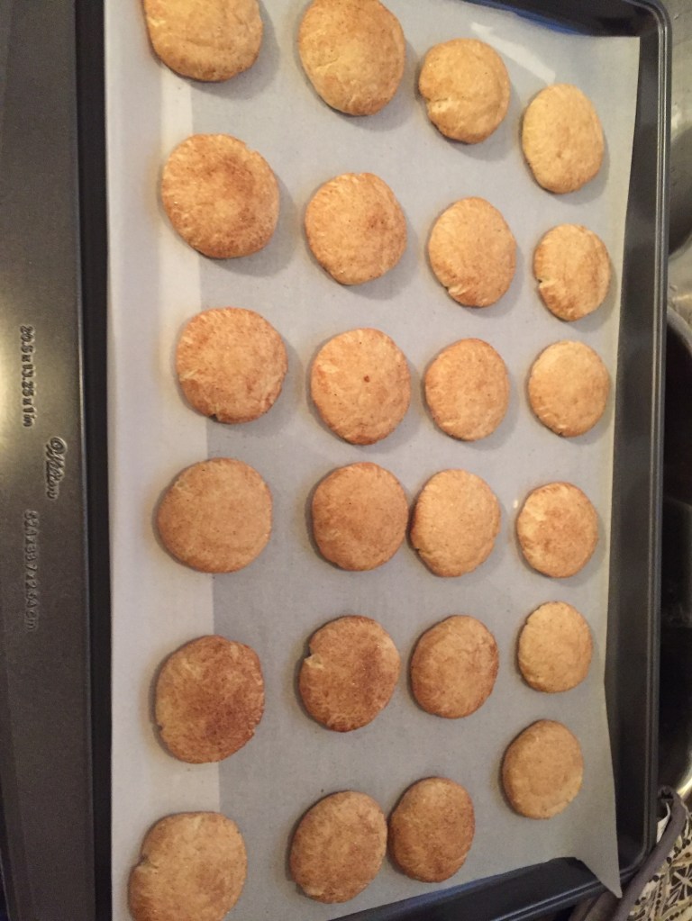 Form the dough into 1 inch balls and roll in the cinnamon/sugar mixture. Place dough ball on a greased baking sheet and flatten (I used the bottom of a glass to lightly flatten my cookies). Sprinkle the tops of the cookies with additional cinnamon/sugar mixture, then bake for 7-8 minutes. Do not overbake these. Remove from oven and let cool on the cookie sheet for 1-2 minutes, then move to a wire rack to cool.