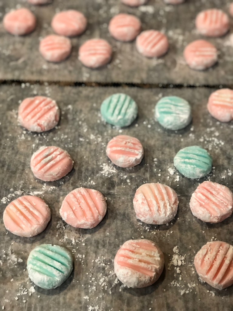 In a mixing bowl, soften the cream cheese. Gradually add the sugar mixing well and then knead until consistency of pie dough. Add flavor and food coloring – knead to distribute color evenly. Roll into small ball (marble size) then dip into the powdered sugar. Place on wax paper and smash gently with a fork. Then let stand for 4 hours until they dry out. May need to flip over.